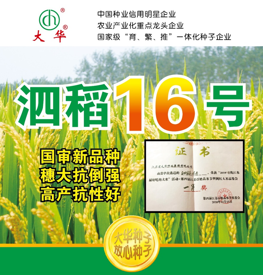 • 大華種業(yè)現(xiàn)階段主營常規(guī)稻麥種子,同時大力發(fā)展雜交玉米、雜交水稻種子經(jīng)營。公司現(xiàn)有“大華牌”水稻種子、小麥種子、大麥種子3個“江蘇省名牌產(chǎn)品”,2012年“大華”商標(biāo)被國家商標(biāo)局認(rèn)定為“中國馳名商標(biāo)”。當(dāng)前,公司在營各類農(nóng)作物品種40多個,其中,常規(guī)水稻主推華粳5號、華粳9號、連粳13、揚(yáng)農(nóng)香28、泗稻16、大華香糯、連糯1號等高產(chǎn)優(yōu)質(zhì)品種;小麥主推華麥5號、華麥8號、華麥1028、鎮(zhèn)麥168、鎮(zhèn)麥10號、揚(yáng)麥29、揚(yáng)輻麥10號、鄭麥1860等高產(chǎn)優(yōu)質(zhì)品種;玉米主推蘇玉34、大華1146、蘇玉糯602等品種。