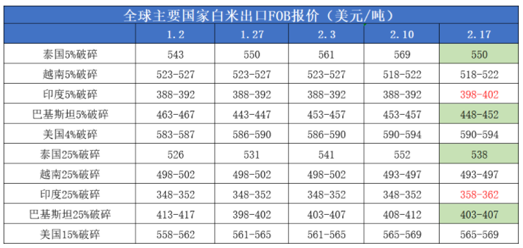 本周印度最大的大米處理地區(qū)又開放一處港口,有望緩解擁堵情況,因此大米出口價(jià)格有所回落,破碎率5%蒸谷米價(jià)格跌至395-401美元,低于一周前的402到408美元。