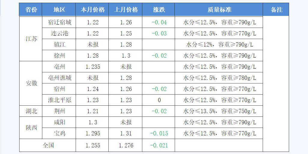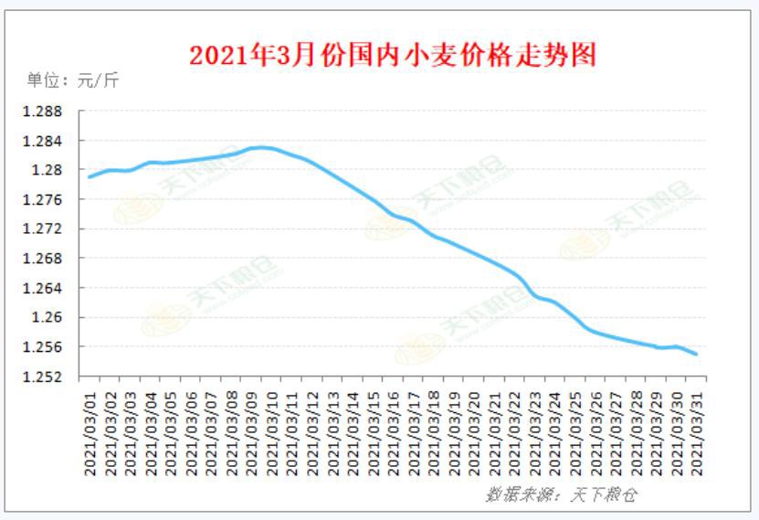 3月1日-3月31日,國內小麥價格滯漲回落。各地小麥價格月度變化情況如下: