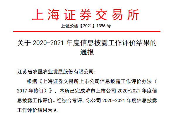 • 日前,上海證券交易所公布滬市主板上市公司2020-2021年度信息披露工作評價結(jié)果,蘇墾農(nóng)發(fā)(股票代碼:601952)獲評最高等級“A”級,是蘇墾農(nóng)發(fā)上市以來連續(xù)第二年獲得信息披露工作最高評級。