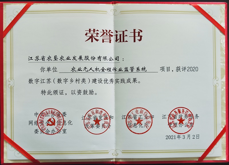 數字江蘇建設優秀實踐成果評選由省委網信辦、省發展改革委、省工信廳等四部門聯合組織,旨在貫徹落實習近平總書記關于網絡強國的重要思想,進一步總結宣傳推廣我省信息化發展的成功經驗和生動實踐,加快推進數字江蘇建設。本次評選工作共征集459個成果項目,最終確定60個項目入選年度“數字江蘇建設優秀實踐成果”。在集團企劃部指導下,蘇墾農發精心組織成果總結和報獎工作,農業無人機作業質量監管系統建設項目獲評2020年數字江蘇建設(數字鄉村類)優秀實踐成果,體現了公司智慧農業建設水平,展示了江蘇農墾形象。