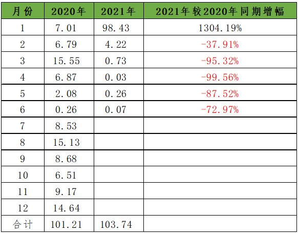 1 俄羅斯大豆出口量2020年與2021年對比情況(單位:萬噸)