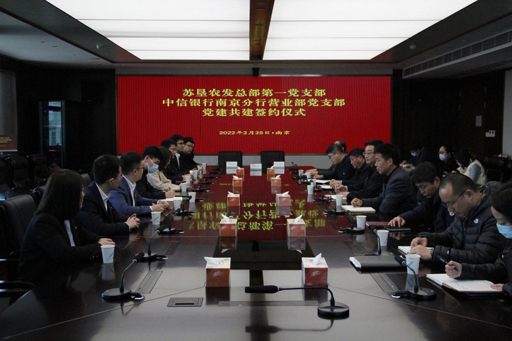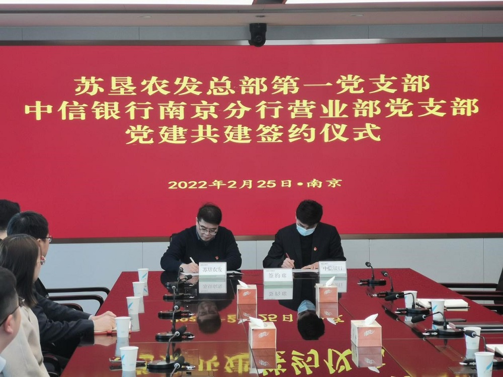 2月25日,蘇墾農(nóng)發(fā)總部第一黨支部與中信銀行南京分行營業(yè)部黨支部舉行黨建共建簽約儀式。簽約前,蘇墾農(nóng)發(fā)總部第一黨支部書記劉剛和中信銀行南京分行營業(yè)部黨支部書記張磊各自介紹了支部基本情況,并就黨員隊伍建設、黨建工作開展以及黨建業(yè)務融合促進等方面內(nèi)容作交流。隨后,雙方代表簽訂《黨建共建協(xié)議書》,并互贈黨建書籍。