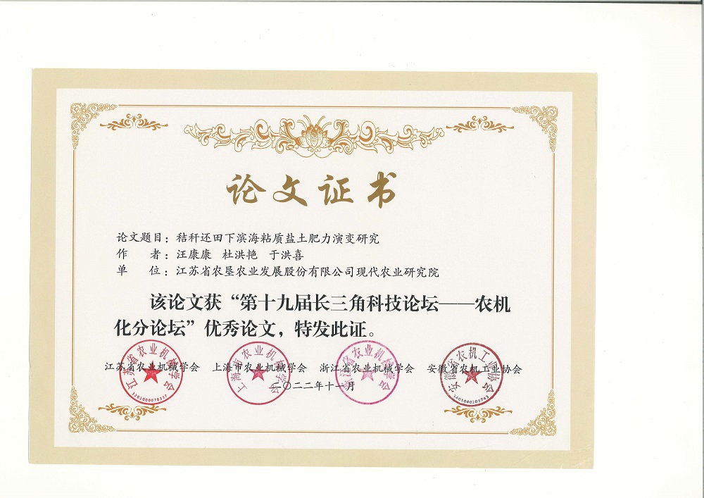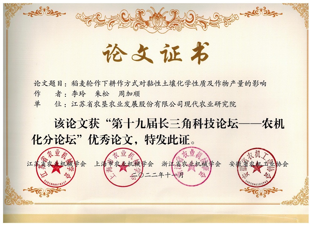 •        11月21日,江蘇省農業機械學會、上海農業機械學會、浙江省農業機械學會、安徽省農機工業協會發布了《關于表彰“第十九屆長三角科技論壇-農機化分論壇”優秀論文的決定》(蘇農機學會〔2022〕12號),江蘇省農墾農業發展股份有限公司現代農業研究院為第一單位的兩篇科技論文 “稻麥輪作下耕作方式對黏性土壤化學性質及作物產量的影響” “秸稈還田下濱海黏質鹽土肥力演變研究”獲得“第十九屆長三角科技論壇-農機化分論壇”優秀論文獎。