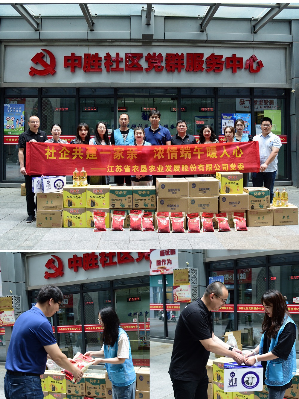 •        在端午節來臨前夕,為弘揚中華傳統美德,加大與所轄社區共駐共建力度,營造文明和諧的節日氛圍,6月21日,蘇墾農發到建鄴區沙洲街道中勝社區開展“社企共建一家親 濃情端午暖人心”慰問活動,給社區一線網格員們送去慰問品和節日祝福。