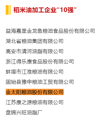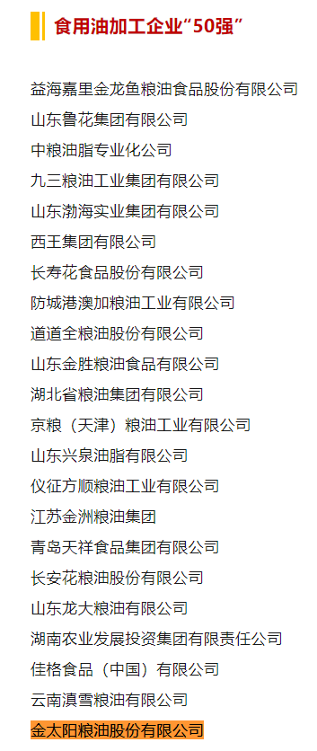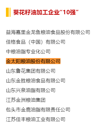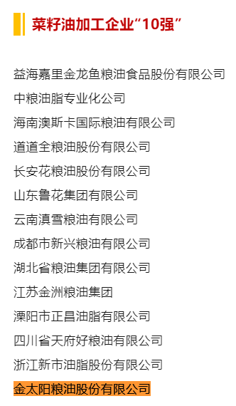 喜報!2024年食用油加工企業(yè)“50強”、“10強”公示名單,金太陽糧油入選榜單!