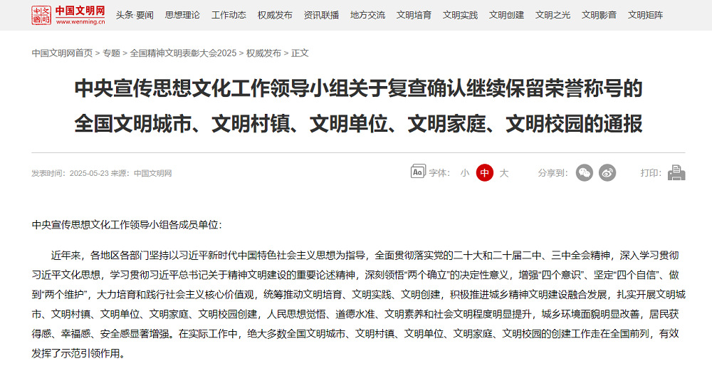 •        5月23日,中央宣傳思想文化工作領導小組公布《關于認定命名第七屆全國文明城市、文明村鎮、文明單位和第三屆全國文明家庭、文明校園的決定》和《關于復查確認繼續保留榮譽稱號的全國文明城市、文明村鎮、文明單位、文明家庭、文明校園的通報》。蘇墾農發順利通過復查評估,繼續保留“全國文明單位”稱號,這是繼2020年首創首成第六屆“全國文明單位”后又一次獲此殊榮。